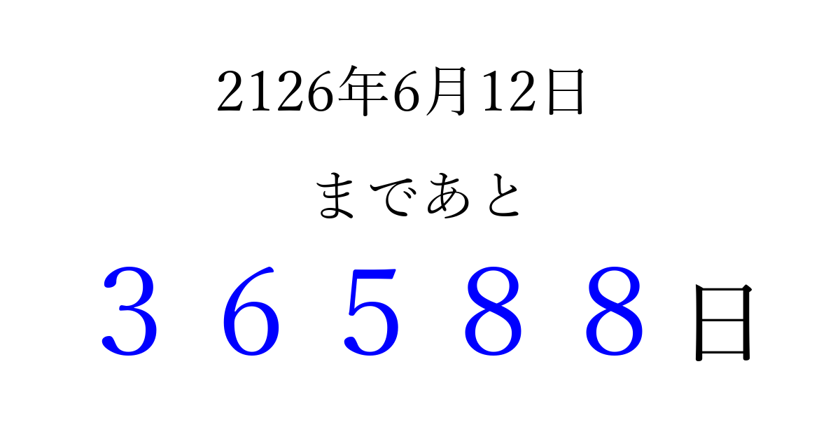 2126年6月12日(水)まで あと 99999 日です 追加すると、トップページからすぐ選べるようになります ※2026/04/09現在の結果です。 最新の状態に更新する ↓シェアして、タイムライン上にカウントダウンを表示しよう!↓ 📤 この結果を共有する Tweet シェア Threads Bluesky 別の日付でカウントダウン 2126年6月のカレンダー このページをブックマークに追加すると、いつでもカウントダウンを確認できます。 (PC: Ctrl+D / Mac: ⌘+D) hitome-notes.comでは以下のページも運営しています。 指定日と期間から日付を計算 | ガチャ確率計算・シミュレーション | プライバシー・ポリシー 運営者:Avocado