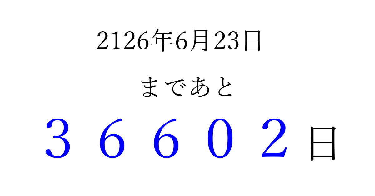2126年6月23日(日)まで あと 99999 日です 追加すると、トップページからすぐ選べるようになります ※2026/04/06現在の結果です。 最新の状態に更新する ↓シェアして、タイムライン上にカウントダウンを表示しよう!↓ 📤 この結果を共有する Tweet シェア Threads Bluesky 別の日付でカウントダウン 2126年6月のカレンダー このページをブックマークに追加すると、いつでもカウントダウンを確認できます。 (PC: Ctrl+D / Mac: ⌘+D) hitome-notes.comでは以下のページも運営しています。 指定日と期間から日付を計算 | ガチャ確率計算・シミュレーション | プライバシー・ポリシー 運営者:Avocado