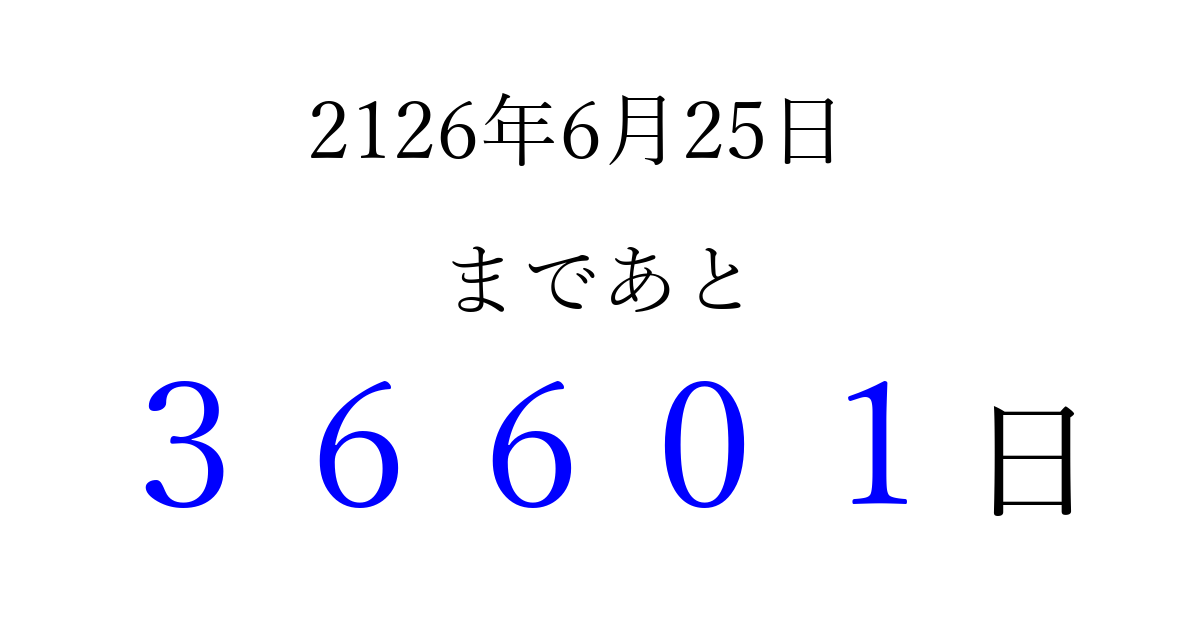 2126年6月25日(火)まで あと 99999 日です 追加すると、トップページからすぐ選べるようになります ※2026/04/09現在の結果です。 最新の状態に更新する ↓シェアして、タイムライン上にカウントダウンを表示しよう!↓ 📤 この結果を共有する Tweet シェア Threads Bluesky 別の日付でカウントダウン 2126年6月のカレンダー このページをブックマークに追加すると、いつでもカウントダウンを確認できます。 (PC: Ctrl+D / Mac: ⌘+D) hitome-notes.comでは以下のページも運営しています。 指定日と期間から日付を計算 | ガチャ確率計算・シミュレーション | プライバシー・ポリシー 運営者:Avocado