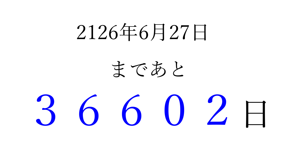 2126年6月27日(木)まで あと 99999 日です 追加すると、トップページからすぐ選べるようになります ※2026/04/10現在の結果です。 最新の状態に更新する ↓シェアして、タイムライン上にカウントダウンを表示しよう!↓ 📤 この結果を共有する Tweet シェア Threads Bluesky 別の日付でカウントダウン 2126年6月のカレンダー このページをブックマークに追加すると、いつでもカウントダウンを確認できます。 (PC: Ctrl+D / Mac: ⌘+D) hitome-notes.comでは以下のページも運営しています。 指定日と期間から日付を計算 | ガチャ確率計算・シミュレーション | プライバシー・ポリシー 運営者:Avocado
