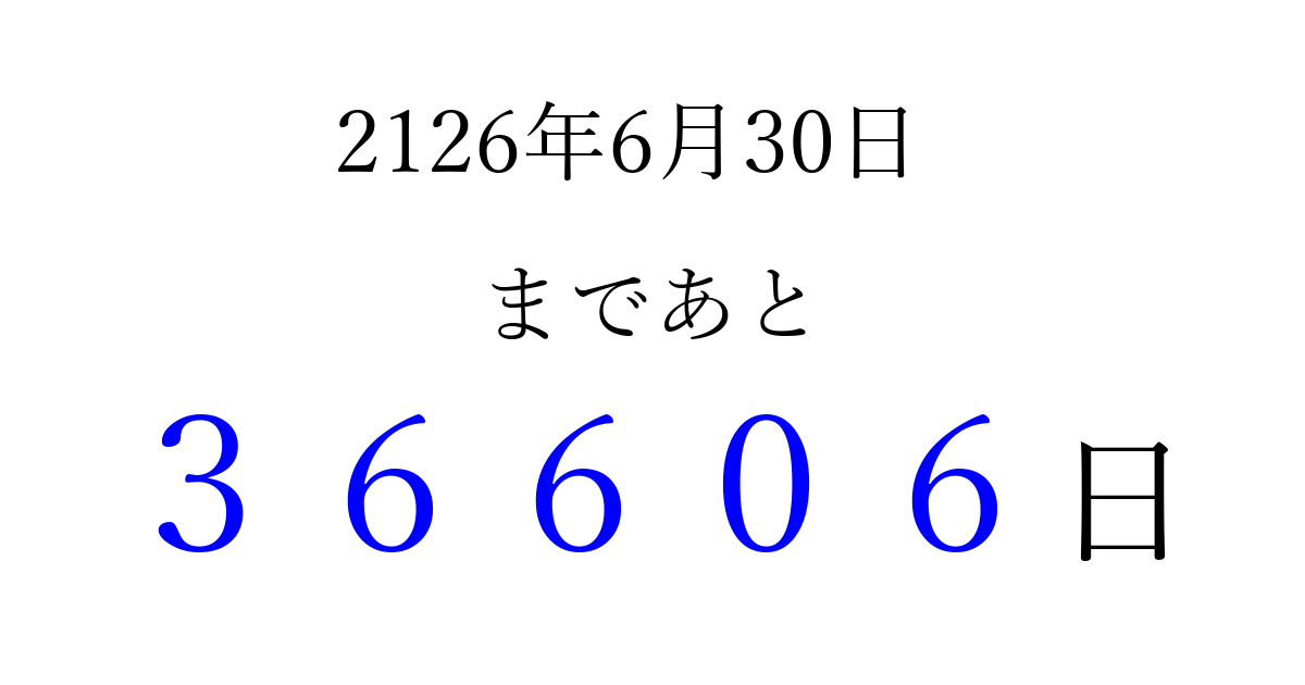 2126年6月30日(日)まで あと 99999 日です 追加すると、トップページからすぐ選べるようになります ※2026/04/09現在の結果です。 最新の状態に更新する ↓シェアして、タイムライン上にカウントダウンを表示しよう!↓ 📤 この結果を共有する Tweet シェア Threads Bluesky 別の日付でカウントダウン 2126年6月のカレンダー このページをブックマークに追加すると、いつでもカウントダウンを確認できます。 (PC: Ctrl+D / Mac: ⌘+D) hitome-notes.comでは以下のページも運営しています。 指定日と期間から日付を計算 | ガチャ確率計算・シミュレーション | プライバシー・ポリシー 運営者:Avocado