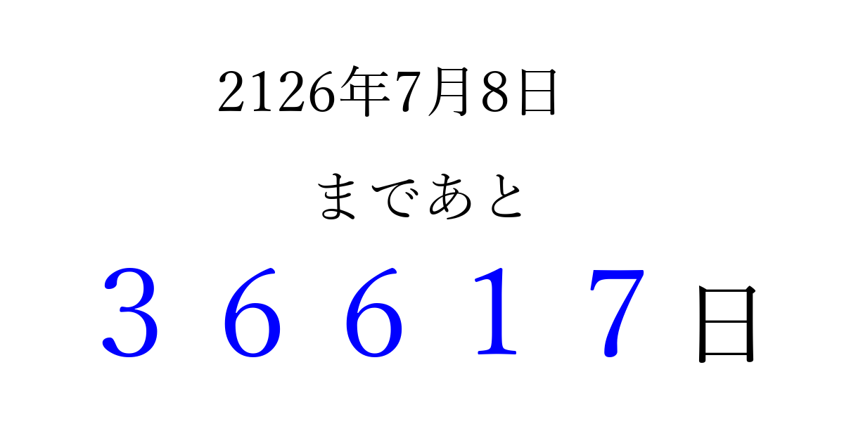 2126年7月8日(月)まで あと 99999 日です 追加すると、トップページからすぐ選べるようになります ※2026/04/06現在の結果です。 最新の状態に更新する ↓シェアして、タイムライン上にカウントダウンを表示しよう!↓ 📤 この結果を共有する Tweet シェア Threads Bluesky 別の日付でカウントダウン 2126年7月のカレンダー このページをブックマークに追加すると、いつでもカウントダウンを確認できます。 (PC: Ctrl+D / Mac: ⌘+D) hitome-notes.comでは以下のページも運営しています。 指定日と期間から日付を計算 | ガチャ確率計算・シミュレーション | プライバシー・ポリシー 運営者:Avocado