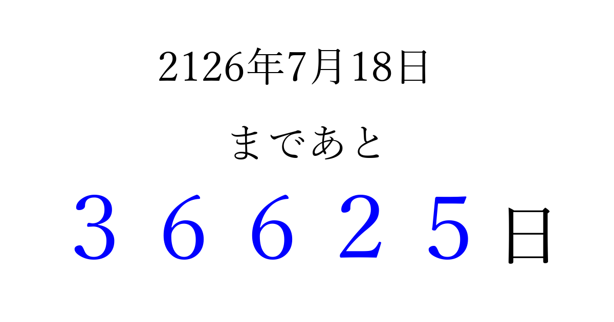2126年7月18日(木)まで あと 99999 日です 追加すると、トップページからすぐ選べるようになります ※2026/04/08現在の結果です。 最新の状態に更新する ↓シェアして、タイムライン上にカウントダウンを表示しよう!↓ 📤 この結果を共有する Tweet シェア Threads Bluesky 別の日付でカウントダウン 2126年7月のカレンダー このページをブックマークに追加すると、いつでもカウントダウンを確認できます。 (PC: Ctrl+D / Mac: ⌘+D) hitome-notes.comでは以下のページも運営しています。 指定日と期間から日付を計算 | ガチャ確率計算・シミュレーション | プライバシー・ポリシー 運営者:Avocado