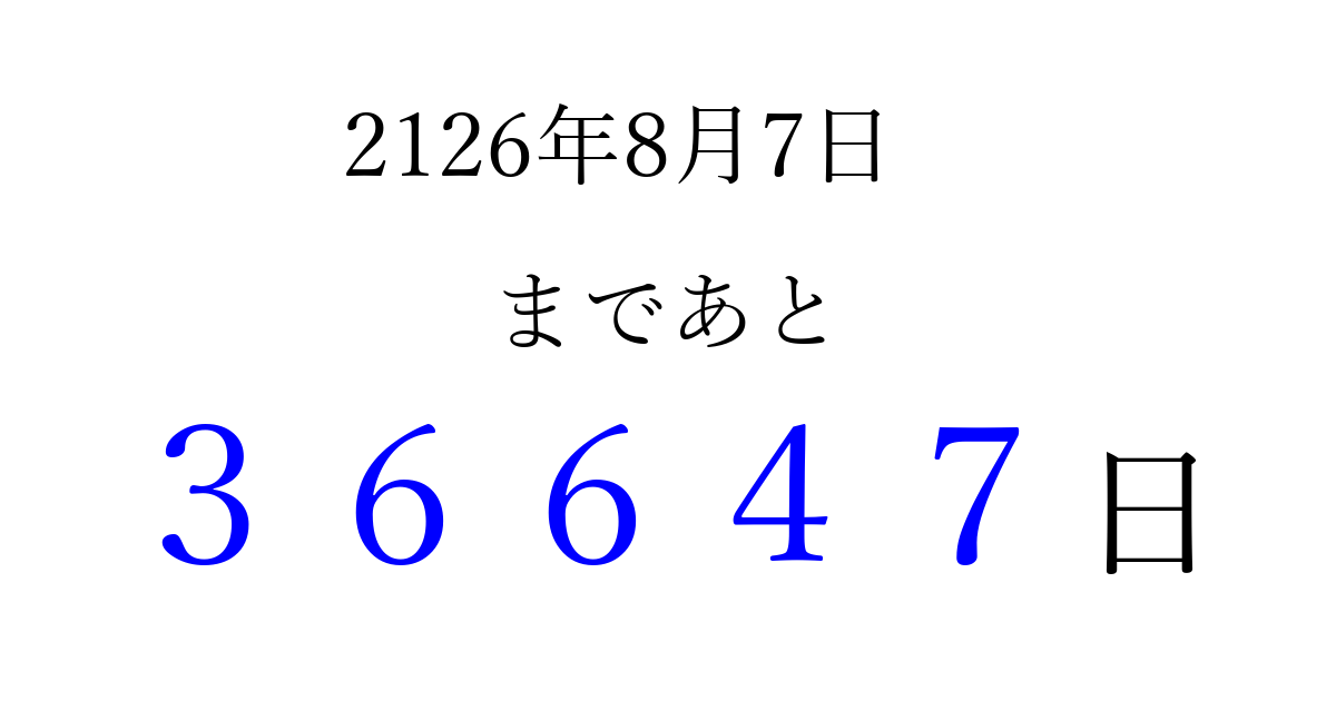 2126年8月7日(水)まで あと 99999 日です 追加すると、トップページからすぐ選べるようになります ※2026/04/06現在の結果です。 最新の状態に更新する ↓シェアして、タイムライン上にカウントダウンを表示しよう!↓ 📤 この結果を共有する Tweet シェア Threads Bluesky 別の日付でカウントダウン 2126年8月のカレンダー このページをブックマークに追加すると、いつでもカウントダウンを確認できます。 (PC: Ctrl+D / Mac: ⌘+D) hitome-notes.comでは以下のページも運営しています。 指定日と期間から日付を計算 | ガチャ確率計算・シミュレーション | プライバシー・ポリシー 運営者:Avocado