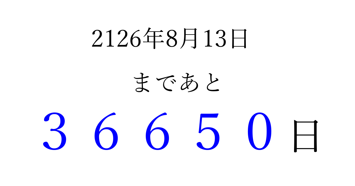 2126年8月13日(火)まで あと 99999 日です 追加すると、トップページからすぐ選べるようになります ※2026/04/09現在の結果です。 最新の状態に更新する ↓シェアして、タイムライン上にカウントダウンを表示しよう!↓ 📤 この結果を共有する Tweet シェア Threads Bluesky 別の日付でカウントダウン 2126年8月のカレンダー このページをブックマークに追加すると、いつでもカウントダウンを確認できます。 (PC: Ctrl+D / Mac: ⌘+D) hitome-notes.comでは以下のページも運営しています。 指定日と期間から日付を計算 | ガチャ確率計算・シミュレーション | プライバシー・ポリシー 運営者:Avocado