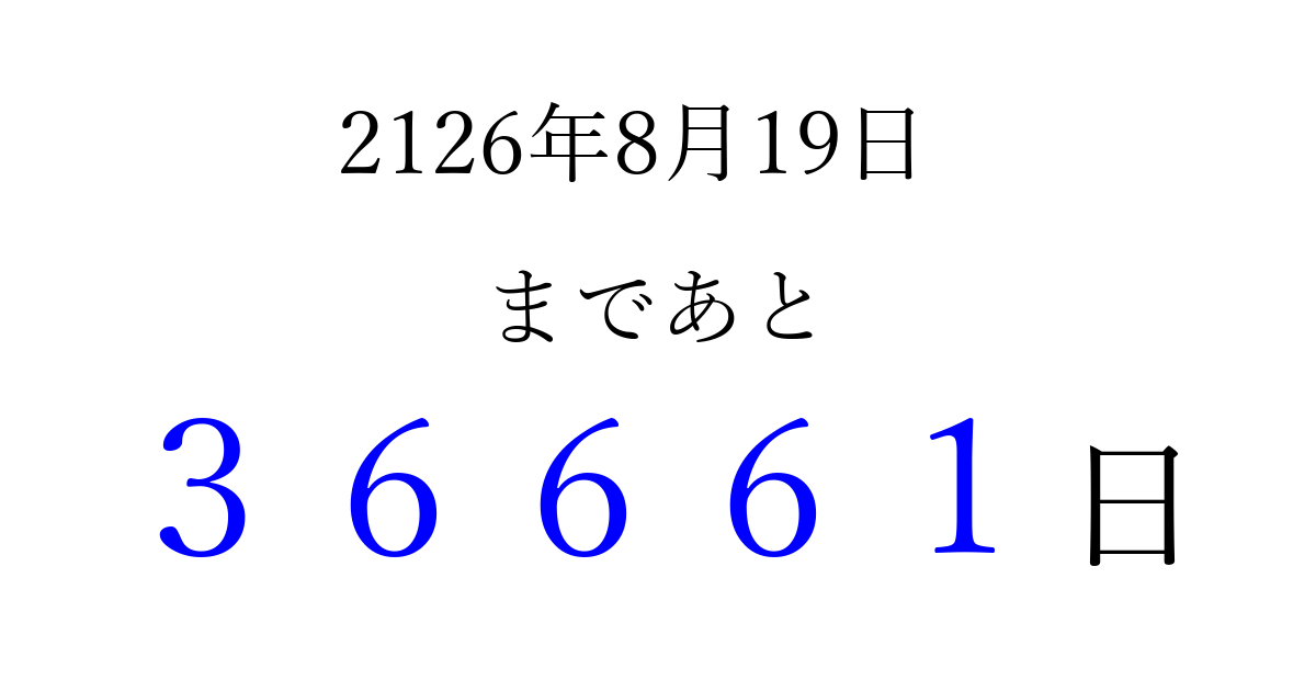 2126年8月19日(月)まで あと 99999 日です 追加すると、トップページからすぐ選べるようになります ※2026/04/04現在の結果です。 最新の状態に更新する ↓シェアして、タイムライン上にカウントダウンを表示しよう!↓ 📤 この結果を共有する Tweet シェア Threads Bluesky 別の日付でカウントダウン 2126年8月のカレンダー このページをブックマークに追加すると、いつでもカウントダウンを確認できます。 (PC: Ctrl+D / Mac: ⌘+D) hitome-notes.comでは以下のページも運営しています。 指定日と期間から日付を計算 | ガチャ確率計算・シミュレーション | プライバシー・ポリシー 運営者:Avocado