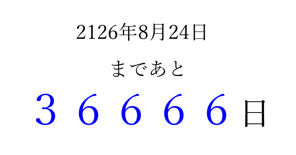 2126年8月24日(土)まで あと 99999 日です 追加すると、トップページからすぐ選べるようになります ※2026/04/04現在の結果です。 最新の状態に更新する ↓シェアして、タイムライン上にカウントダウンを表示しよう!↓ 📤 この結果を共有する Tweet シェア Threads Bluesky 別の日付でカウントダウン 2126年8月のカレンダー このページをブックマークに追加すると、いつでもカウントダウンを確認できます。 (PC: Ctrl+D / Mac: ⌘+D) hitome-notes.comでは以下のページも運営しています。 指定日と期間から日付を計算 | ガチャ確率計算・シミュレーション | プライバシー・ポリシー 運営者:Avocado