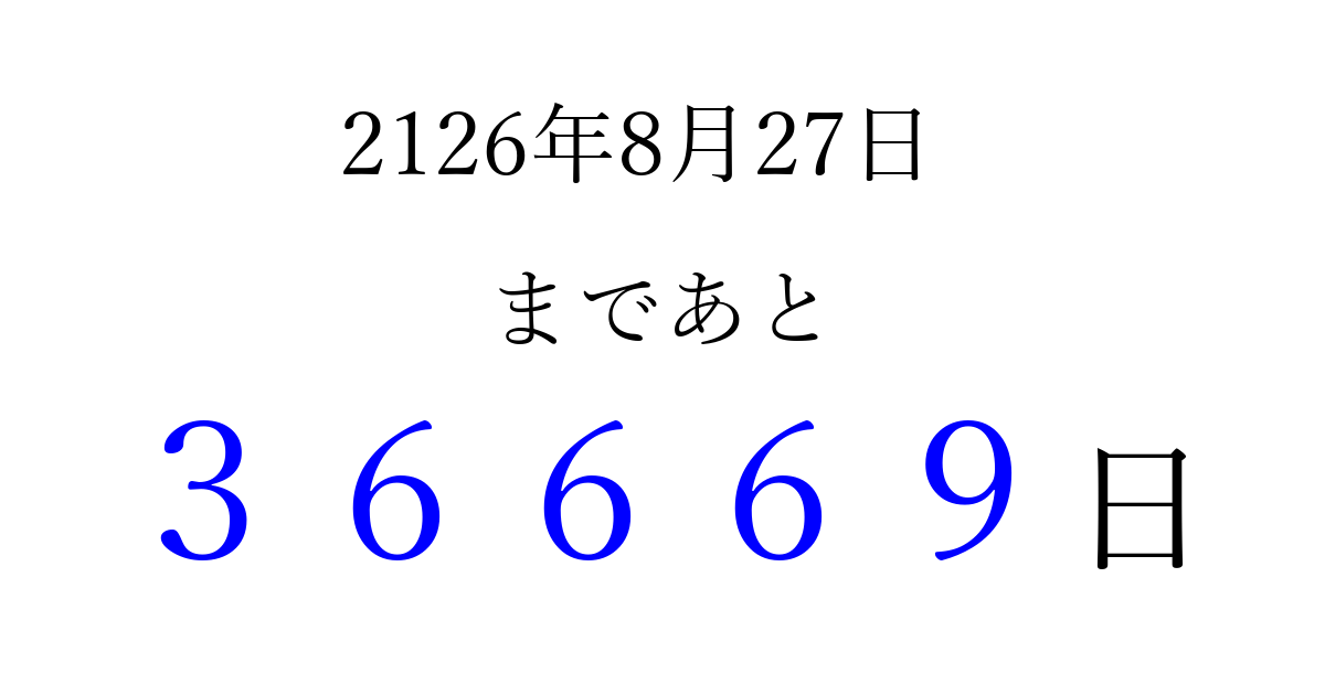 2126年8月27日(火)まで あと 99999 日です 追加すると、トップページからすぐ選べるようになります ※2026/04/04現在の結果です。 最新の状態に更新する ↓シェアして、タイムライン上にカウントダウンを表示しよう!↓ 📤 この結果を共有する Tweet シェア Threads Bluesky 別の日付でカウントダウン 2126年8月のカレンダー このページをブックマークに追加すると、いつでもカウントダウンを確認できます。 (PC: Ctrl+D / Mac: ⌘+D) hitome-notes.comでは以下のページも運営しています。 指定日と期間から日付を計算 | ガチャ確率計算・シミュレーション | プライバシー・ポリシー 運営者:Avocado