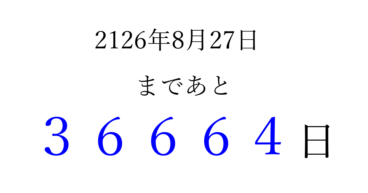 2126年8月27日(火)まで あと 99999 日です 追加すると、トップページからすぐ選べるようになります ※2026/04/09現在の結果です。 最新の状態に更新する ↓シェアして、タイムライン上にカウントダウンを表示しよう!↓ 📤 この結果を共有する Tweet シェア Threads Bluesky 別の日付でカウントダウン 2126年8月のカレンダー このページをブックマークに追加すると、いつでもカウントダウンを確認できます。 (PC: Ctrl+D / Mac: ⌘+D) hitome-notes.comでは以下のページも運営しています。 指定日と期間から日付を計算 | ガチャ確率計算・シミュレーション | プライバシー・ポリシー 運営者:Avocado