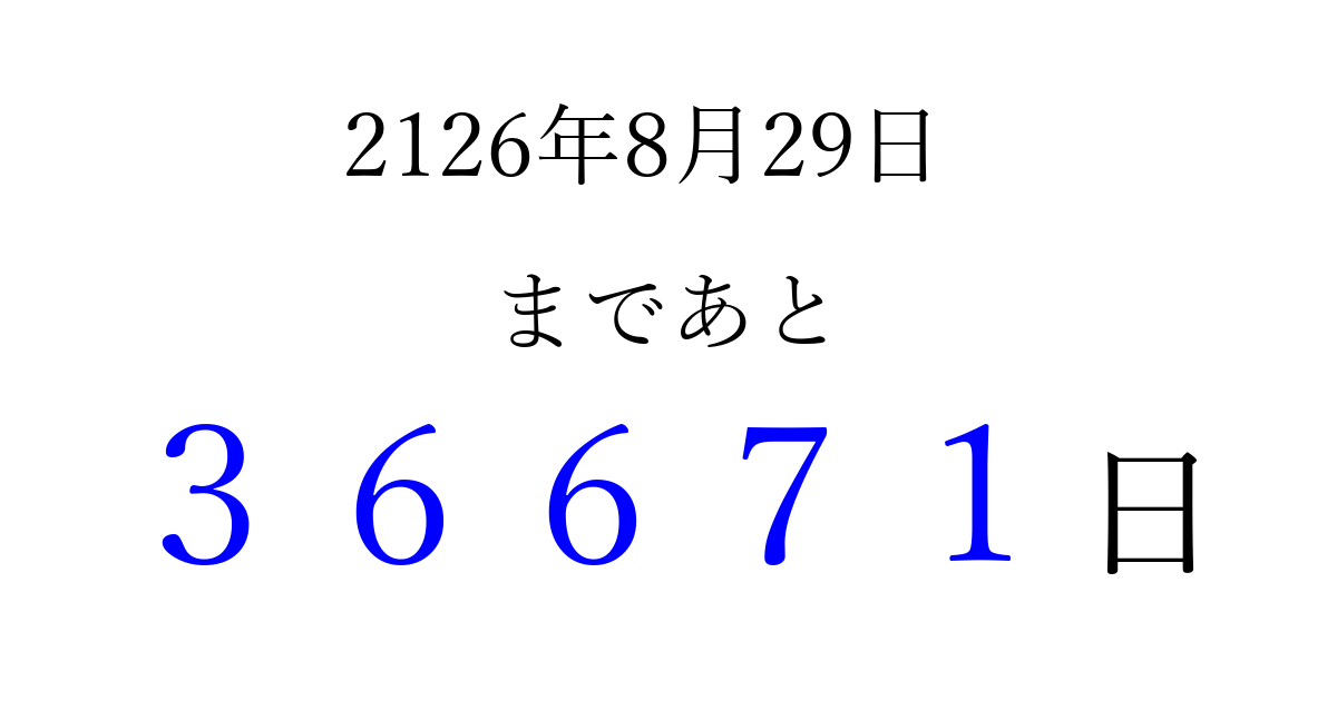 2126年8月29日(木)まで あと 99999 日です 追加すると、トップページからすぐ選べるようになります ※2026/04/04現在の結果です。 最新の状態に更新する ↓シェアして、タイムライン上にカウントダウンを表示しよう!↓ 📤 この結果を共有する Tweet シェア Threads Bluesky 別の日付でカウントダウン 2126年8月のカレンダー このページをブックマークに追加すると、いつでもカウントダウンを確認できます。 (PC: Ctrl+D / Mac: ⌘+D) hitome-notes.comでは以下のページも運営しています。 指定日と期間から日付を計算 | ガチャ確率計算・シミュレーション | プライバシー・ポリシー 運営者:Avocado