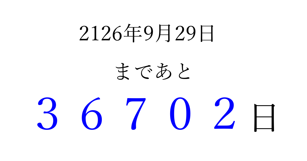 2126年9月29日(日)まで あと 99999 日です 追加すると、トップページからすぐ選べるようになります ※2026/04/04現在の結果です。 最新の状態に更新する ↓シェアして、タイムライン上にカウントダウンを表示しよう!↓ 📤 この結果を共有する Tweet シェア Threads Bluesky 別の日付でカウントダウン 2126年9月のカレンダー このページをブックマークに追加すると、いつでもカウントダウンを確認できます。 (PC: Ctrl+D / Mac: ⌘+D) hitome-notes.comでは以下のページも運営しています。 指定日と期間から日付を計算 | ガチャ確率計算・シミュレーション | プライバシー・ポリシー 運営者:Avocado