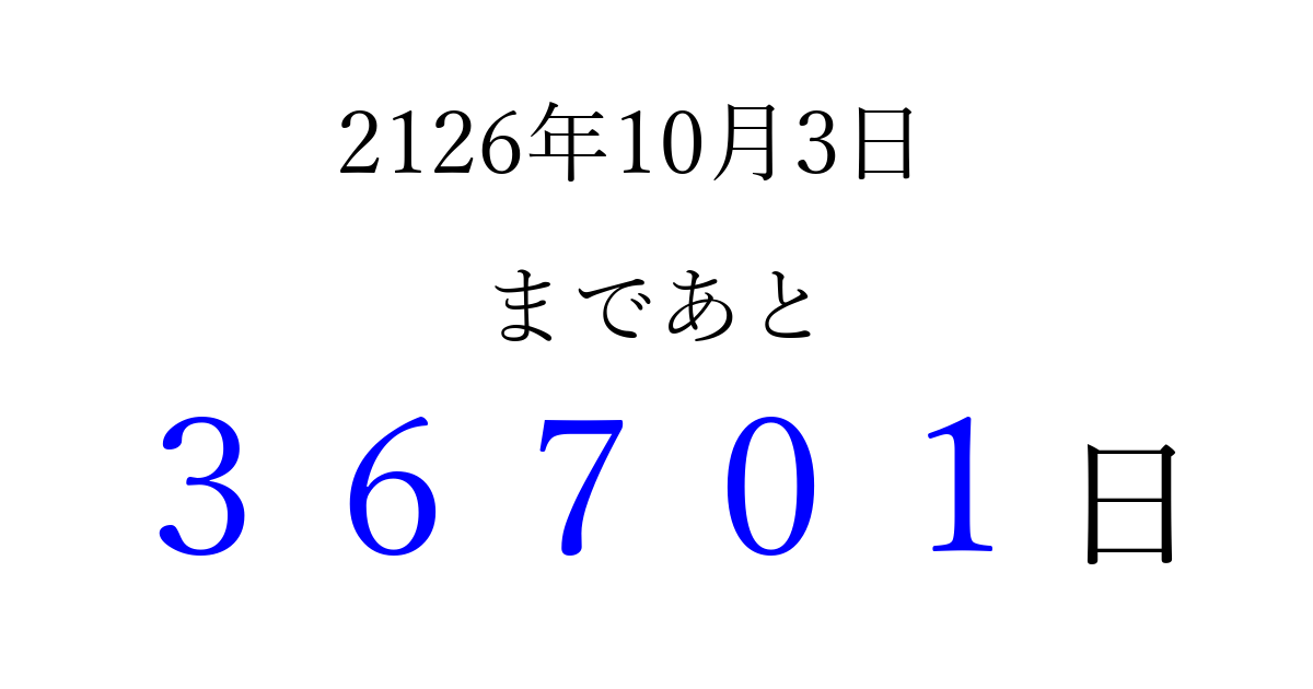 2126年10月3日(木)まで あと 99999 日です 追加すると、トップページからすぐ選べるようになります ※2026/04/09現在の結果です。 最新の状態に更新する ↓シェアして、タイムライン上にカウントダウンを表示しよう!↓ 📤 この結果を共有する Tweet シェア Threads Bluesky 別の日付でカウントダウン 2126年10月のカレンダー このページをブックマークに追加すると、いつでもカウントダウンを確認できます。 (PC: Ctrl+D / Mac: ⌘+D) hitome-notes.comでは以下のページも運営しています。 指定日と期間から日付を計算 | ガチャ確率計算・シミュレーション | プライバシー・ポリシー 運営者:Avocado
