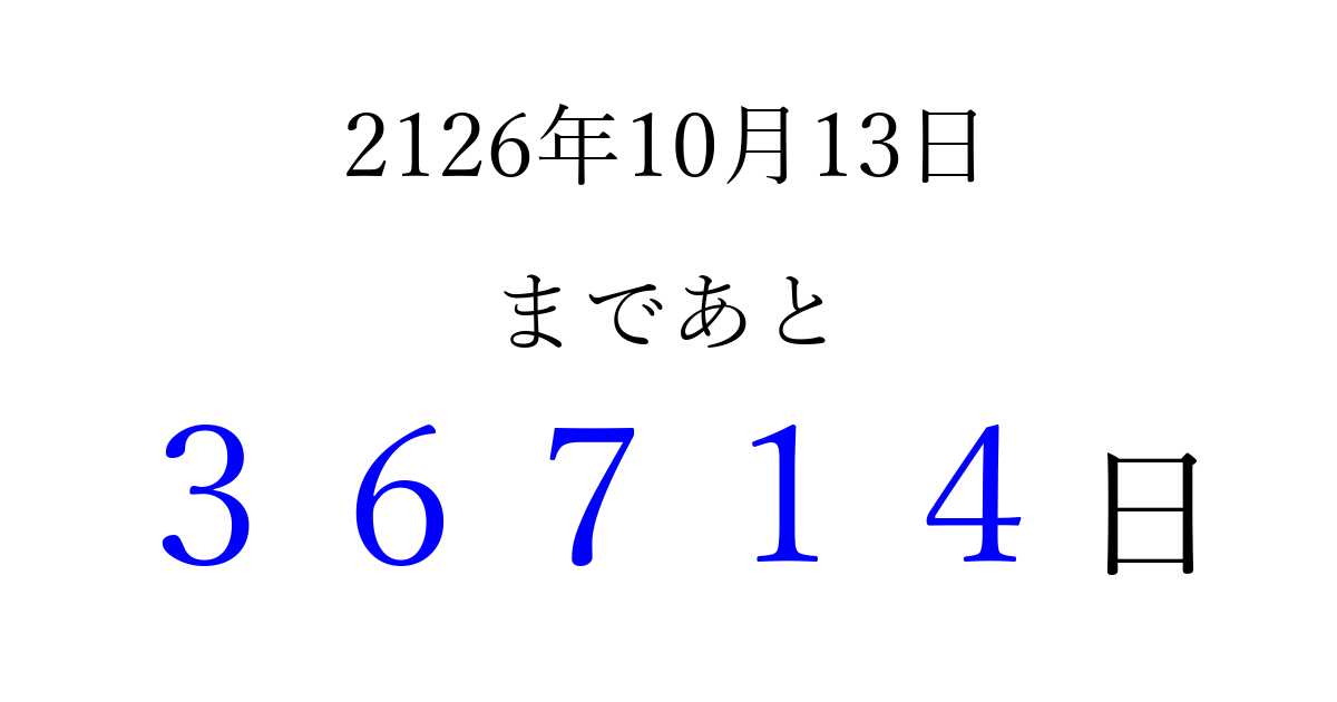 2126年10月13日(日)まで あと 99999 日です 追加すると、トップページからすぐ選べるようになります ※2026/04/06現在の結果です。 最新の状態に更新する ↓シェアして、タイムライン上にカウントダウンを表示しよう!↓ 📤 この結果を共有する Tweet シェア Threads Bluesky 別の日付でカウントダウン 2126年10月のカレンダー このページをブックマークに追加すると、いつでもカウントダウンを確認できます。 (PC: Ctrl+D / Mac: ⌘+D) hitome-notes.comでは以下のページも運営しています。 指定日と期間から日付を計算 | ガチャ確率計算・シミュレーション | プライバシー・ポリシー 運営者:Avocado