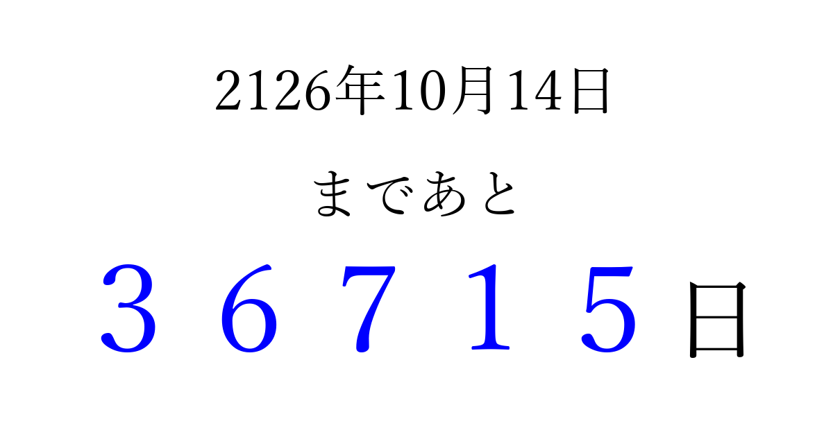 2126年10月14日(月)まで あと 99999 日です 追加すると、トップページからすぐ選べるようになります ※2026/04/06現在の結果です。 最新の状態に更新する ↓シェアして、タイムライン上にカウントダウンを表示しよう!↓ 📤 この結果を共有する Tweet シェア Threads Bluesky 別の日付でカウントダウン 2126年10月のカレンダー このページをブックマークに追加すると、いつでもカウントダウンを確認できます。 (PC: Ctrl+D / Mac: ⌘+D) hitome-notes.comでは以下のページも運営しています。 指定日と期間から日付を計算 | ガチャ確率計算・シミュレーション | プライバシー・ポリシー 運営者:Avocado