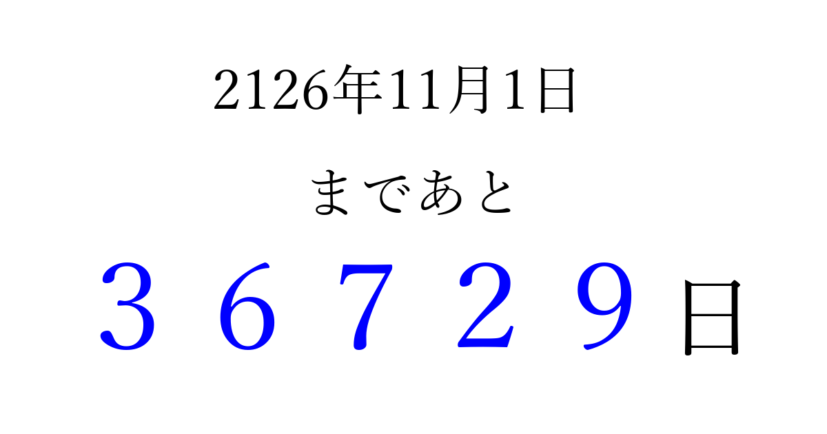 2126年11月1日(金)まで あと 99999 日です 追加すると、トップページからすぐ選べるようになります ※2026/04/10現在の結果です。 最新の状態に更新する ↓シェアして、タイムライン上にカウントダウンを表示しよう!↓ 📤 この結果を共有する Tweet シェア Threads Bluesky 別の日付でカウントダウン 2126年11月のカレンダー このページをブックマークに追加すると、いつでもカウントダウンを確認できます。 (PC: Ctrl+D / Mac: ⌘+D) hitome-notes.comでは以下のページも運営しています。 指定日と期間から日付を計算 | ガチャ確率計算・シミュレーション | プライバシー・ポリシー 運営者:Avocado