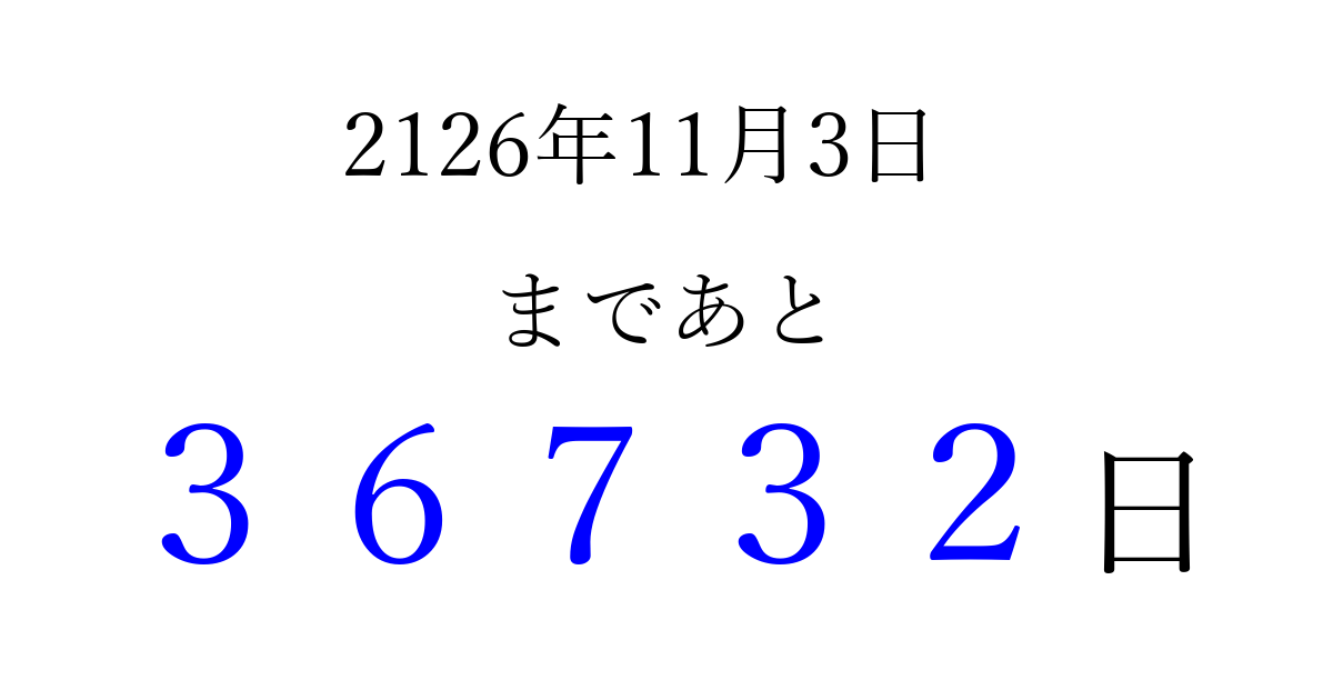 2126年11月3日(日)まで あと 99999 日です 追加すると、トップページからすぐ選べるようになります ※2026/04/09現在の結果です。 最新の状態に更新する ↓シェアして、タイムライン上にカウントダウンを表示しよう!↓ 📤 この結果を共有する Tweet シェア Threads Bluesky 別の日付でカウントダウン 2126年11月のカレンダー このページをブックマークに追加すると、いつでもカウントダウンを確認できます。 (PC: Ctrl+D / Mac: ⌘+D) hitome-notes.comでは以下のページも運営しています。 指定日と期間から日付を計算 | ガチャ確率計算・シミュレーション | プライバシー・ポリシー 運営者:Avocado
