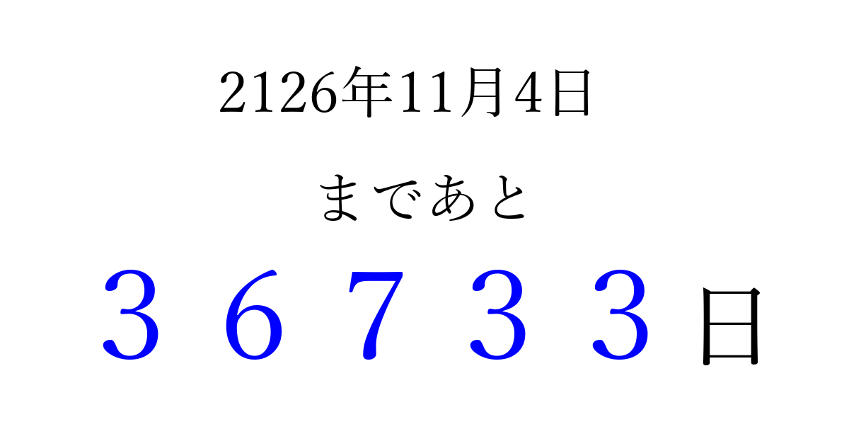 2126年11月4日(月)まで あと 99999 日です 追加すると、トップページからすぐ選べるようになります ※2026/04/09現在の結果です。 最新の状態に更新する ↓シェアして、タイムライン上にカウントダウンを表示しよう!↓ 📤 この結果を共有する Tweet シェア Threads Bluesky 別の日付でカウントダウン 2126年11月のカレンダー このページをブックマークに追加すると、いつでもカウントダウンを確認できます。 (PC: Ctrl+D / Mac: ⌘+D) hitome-notes.comでは以下のページも運営しています。 指定日と期間から日付を計算 | ガチャ確率計算・シミュレーション | プライバシー・ポリシー 運営者:Avocado
