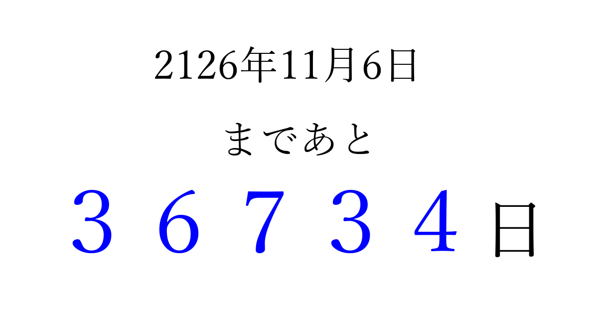 2126年11月6日(水)まで あと 99999 日です 追加すると、トップページからすぐ選べるようになります ※2026/04/10現在の結果です。 最新の状態に更新する ↓シェアして、タイムライン上にカウントダウンを表示しよう!↓ 📤 この結果を共有する Tweet シェア Threads Bluesky 別の日付でカウントダウン 2126年11月のカレンダー このページをブックマークに追加すると、いつでもカウントダウンを確認できます。 (PC: Ctrl+D / Mac: ⌘+D) hitome-notes.comでは以下のページも運営しています。 指定日と期間から日付を計算 | ガチャ確率計算・シミュレーション | プライバシー・ポリシー 運営者:Avocado