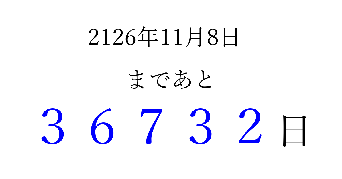2126年11月8日(金)まで あと 99999 日です 追加すると、トップページからすぐ選べるようになります ※2026/04/14現在の結果です。 最新の状態に更新する ↓シェアして、タイムライン上にカウントダウンを表示しよう!↓ 📤 この結果を共有する Tweet シェア Threads Bluesky 別の日付でカウントダウン 2126年11月のカレンダー このページをブックマークに追加すると、いつでもカウントダウンを確認できます。 (PC: Ctrl+D / Mac: ⌘+D) hitome-notes.comでは以下のページも運営しています。 指定日と期間から日付を計算 | ガチャ確率計算・シミュレーション | プライバシー・ポリシー 運営者:Avocado