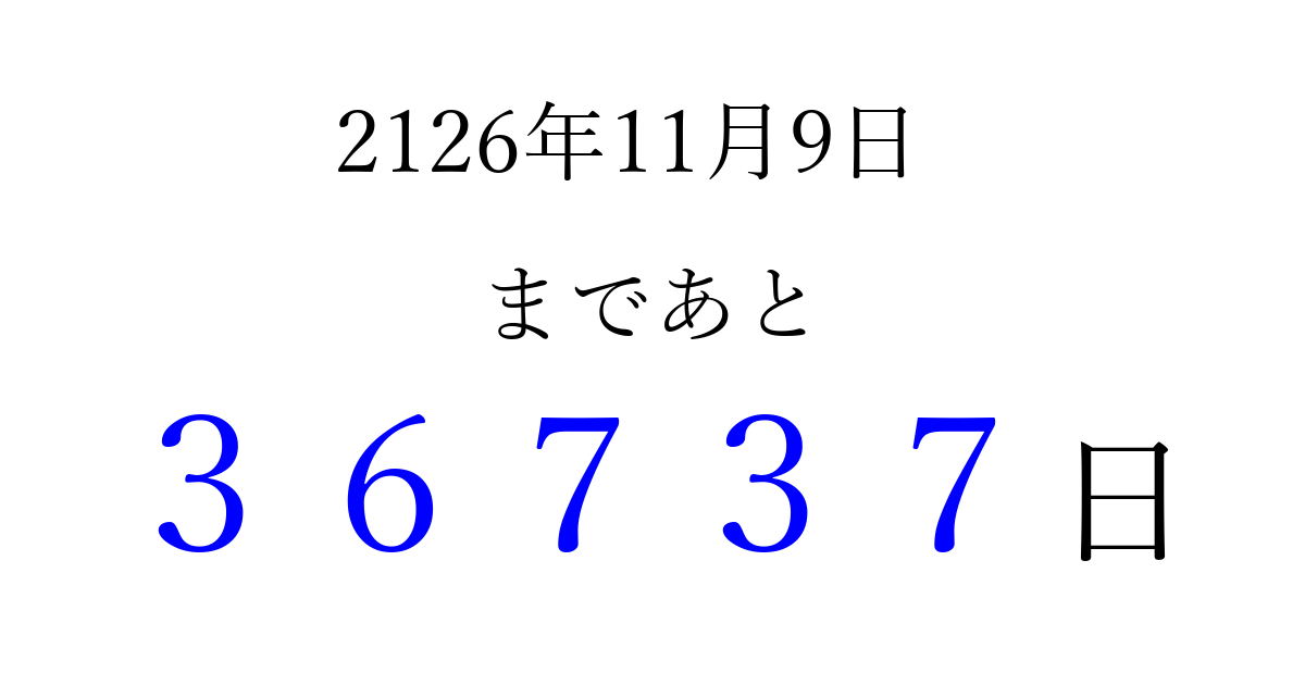 2126年11月9日(土)まで あと 99999 日です 追加すると、トップページからすぐ選べるようになります ※2026/04/10現在の結果です。 最新の状態に更新する ↓シェアして、タイムライン上にカウントダウンを表示しよう!↓ 📤 この結果を共有する Tweet シェア Threads Bluesky 別の日付でカウントダウン 2126年11月のカレンダー このページをブックマークに追加すると、いつでもカウントダウンを確認できます。 (PC: Ctrl+D / Mac: ⌘+D) hitome-notes.comでは以下のページも運営しています。 指定日と期間から日付を計算 | ガチャ確率計算・シミュレーション | プライバシー・ポリシー 運営者:Avocado