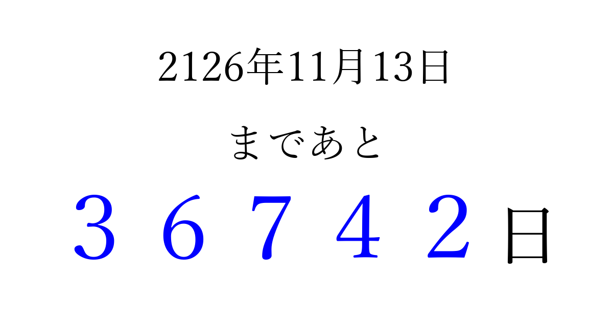 2126年11月13日(水)まで あと 99999 日です 追加すると、トップページからすぐ選べるようになります ※2026/04/09現在の結果です。 最新の状態に更新する ↓シェアして、タイムライン上にカウントダウンを表示しよう!↓ 📤 この結果を共有する Tweet シェア Threads Bluesky 別の日付でカウントダウン 2126年11月のカレンダー このページをブックマークに追加すると、いつでもカウントダウンを確認できます。 (PC: Ctrl+D / Mac: ⌘+D) hitome-notes.comでは以下のページも運営しています。 指定日と期間から日付を計算 | ガチャ確率計算・シミュレーション | プライバシー・ポリシー 運営者:Avocado