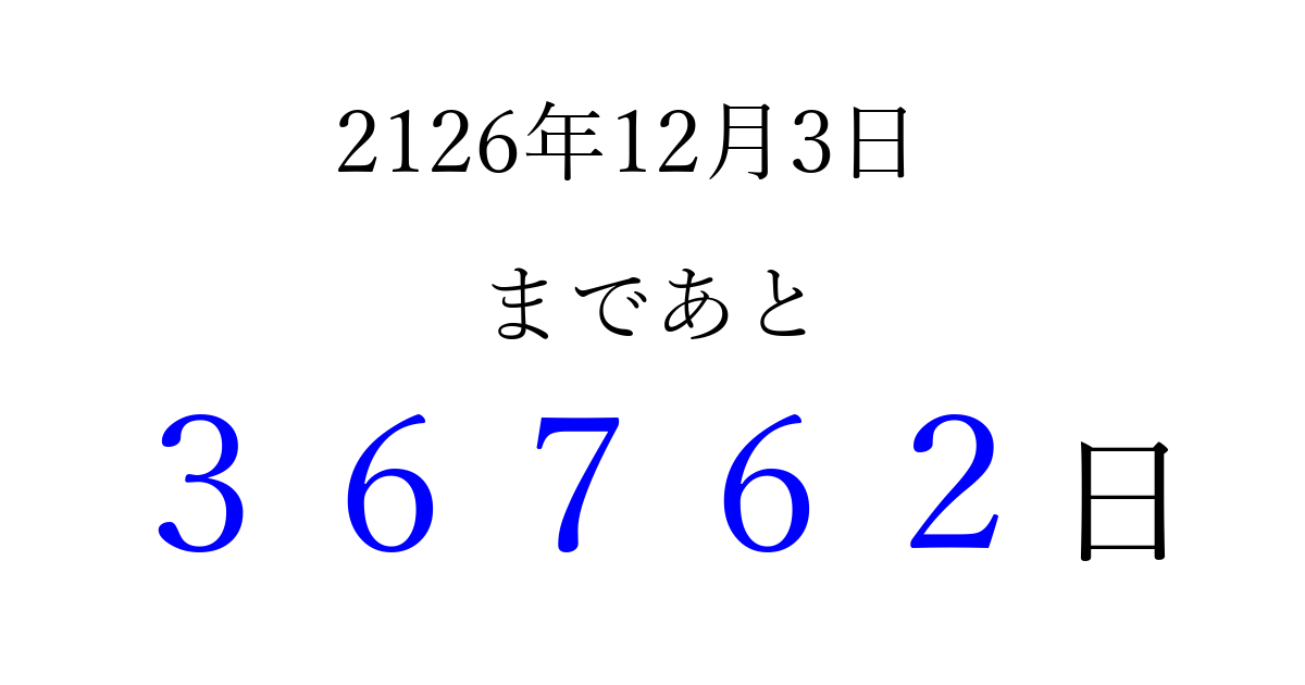 2126年12月3日(火)まで あと 99999 日です 追加すると、トップページからすぐ選べるようになります ※2026/04/09現在の結果です。 最新の状態に更新する ↓シェアして、タイムライン上にカウントダウンを表示しよう!↓ 📤 この結果を共有する Tweet シェア Threads Bluesky 別の日付でカウントダウン 2126年12月のカレンダー このページをブックマークに追加すると、いつでもカウントダウンを確認できます。 (PC: Ctrl+D / Mac: ⌘+D) hitome-notes.comでは以下のページも運営しています。 指定日と期間から日付を計算 | ガチャ確率計算・シミュレーション | プライバシー・ポリシー 運営者:Avocado