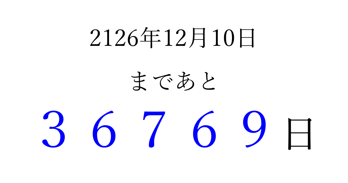2126年12月10日(火)まで あと 99999 日です 追加すると、トップページからすぐ選べるようになります ※2026/04/09現在の結果です。 最新の状態に更新する ↓シェアして、タイムライン上にカウントダウンを表示しよう!↓ 📤 この結果を共有する Tweet シェア Threads Bluesky 別の日付でカウントダウン 2126年12月のカレンダー このページをブックマークに追加すると、いつでもカウントダウンを確認できます。 (PC: Ctrl+D / Mac: ⌘+D) hitome-notes.comでは以下のページも運営しています。 指定日と期間から日付を計算 | ガチャ確率計算・シミュレーション | プライバシー・ポリシー 運営者:Avocado