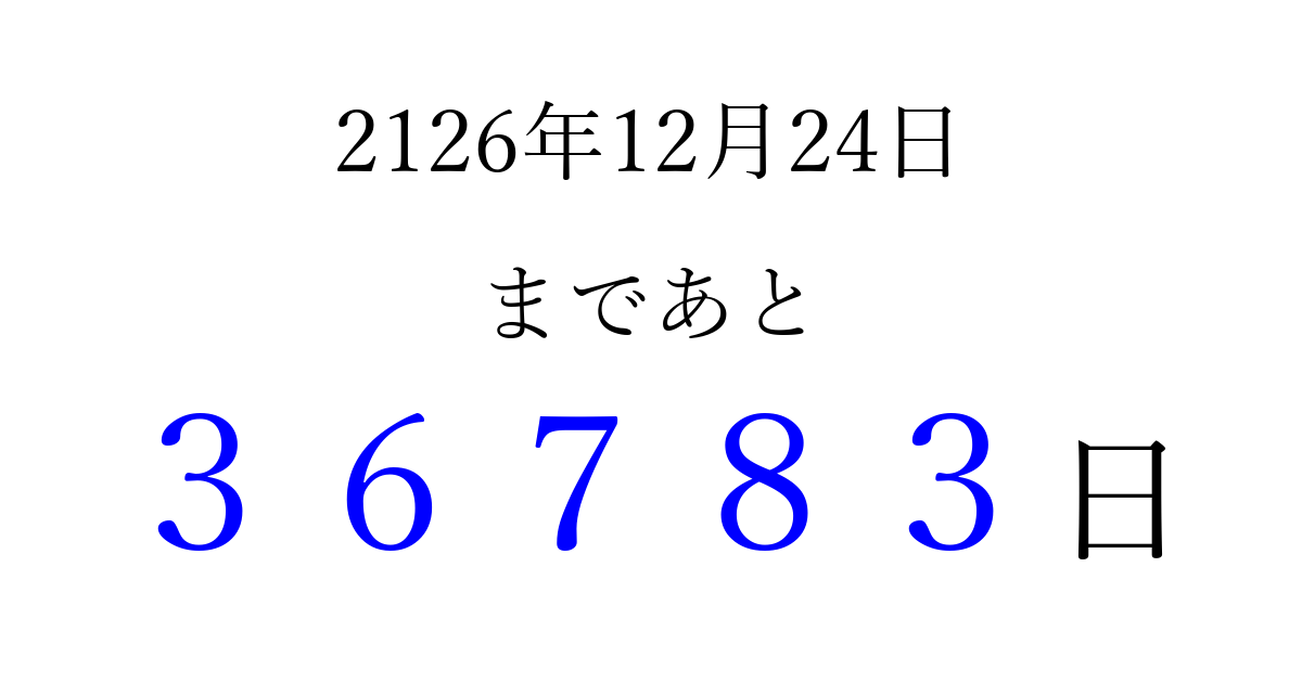 2126年12月24日(火)まで あと 99999 日です 追加すると、トップページからすぐ選べるようになります ※2026/04/09現在の結果です。 最新の状態に更新する ↓シェアして、タイムライン上にカウントダウンを表示しよう!↓ 📤 この結果を共有する Tweet シェア Threads Bluesky 別の日付でカウントダウン 2126年12月のカレンダー このページをブックマークに追加すると、いつでもカウントダウンを確認できます。 (PC: Ctrl+D / Mac: ⌘+D) hitome-notes.comでは以下のページも運営しています。 指定日と期間から日付を計算 | ガチャ確率計算・シミュレーション | プライバシー・ポリシー 運営者:Avocado
