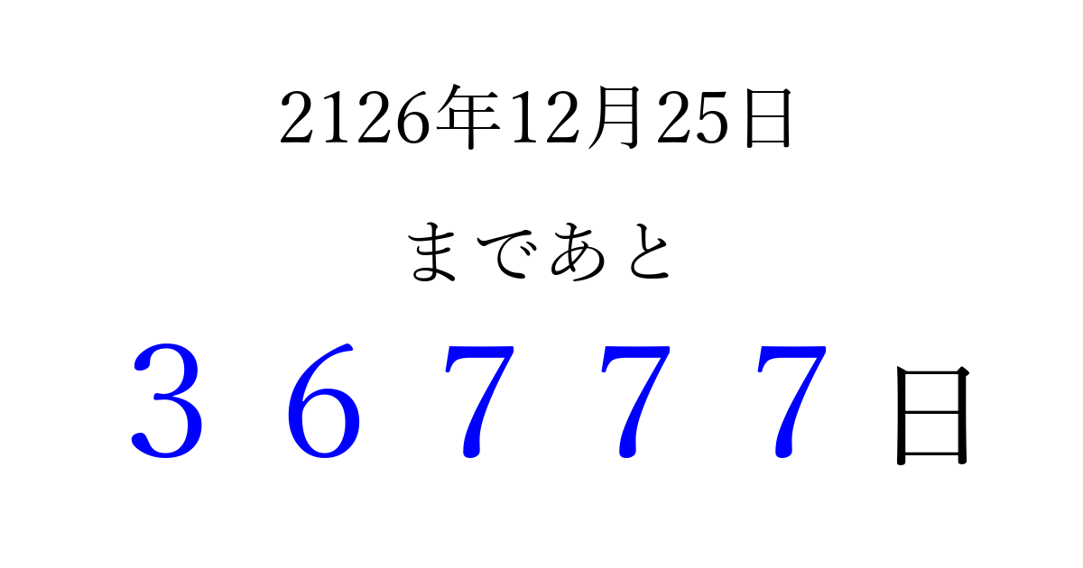 2126年12月25日(水)まで あと 99999 日です 追加すると、トップページからすぐ選べるようになります ※2026/04/16現在の結果です。 最新の状態に更新する ↓シェアして、タイムライン上にカウントダウンを表示しよう!↓ 📤 この結果を共有する Tweet シェア Threads Bluesky 別の日付でカウントダウン 2126年12月のカレンダー このページをブックマークに追加すると、いつでもカウントダウンを確認できます。 (PC: Ctrl+D / Mac: ⌘+D) hitome-notes.comでは以下のページも運営しています。 指定日と期間から日付を計算 | ガチャ確率計算・シミュレーション | プライバシー・ポリシー 運営者:Avocado