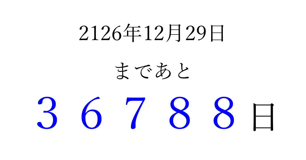 2126年12月29日(日)まで あと 99999 日です 追加すると、トップページからすぐ選べるようになります ※2026/04/09現在の結果です。 最新の状態に更新する ↓シェアして、タイムライン上にカウントダウンを表示しよう!↓ 📤 この結果を共有する Tweet シェア Threads Bluesky 別の日付でカウントダウン 2126年12月のカレンダー このページをブックマークに追加すると、いつでもカウントダウンを確認できます。 (PC: Ctrl+D / Mac: ⌘+D) hitome-notes.comでは以下のページも運営しています。 指定日と期間から日付を計算 | ガチャ確率計算・シミュレーション | プライバシー・ポリシー 運営者:Avocado