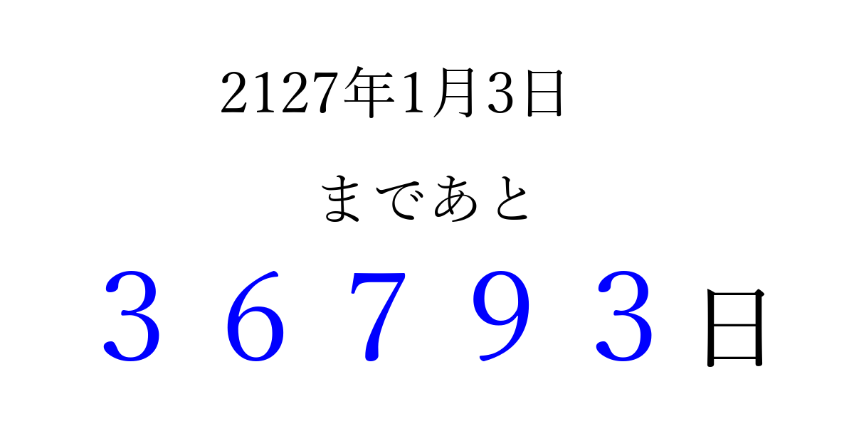 2127年1月3日(金)まで あと 99999 日です 追加すると、トップページからすぐ選べるようになります ※2026/04/09現在の結果です。 最新の状態に更新する ↓シェアして、タイムライン上にカウントダウンを表示しよう!↓ 📤 この結果を共有する Tweet シェア Threads Bluesky 別の日付でカウントダウン 2127年1月のカレンダー このページをブックマークに追加すると、いつでもカウントダウンを確認できます。 (PC: Ctrl+D / Mac: ⌘+D) hitome-notes.comでは以下のページも運営しています。 指定日と期間から日付を計算 | ガチャ確率計算・シミュレーション | プライバシー・ポリシー 運営者:Avocado