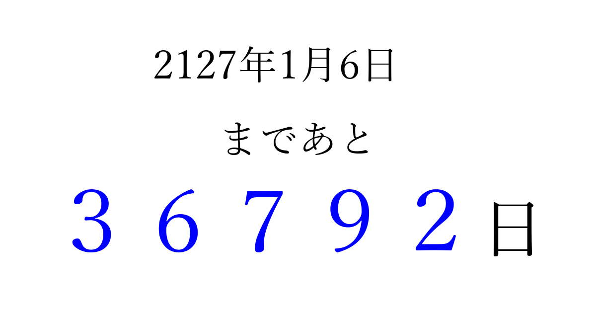 2127年1月6日(月)まで あと 99999 日です 追加すると、トップページからすぐ選べるようになります ※2026/04/13現在の結果です。 最新の状態に更新する ↓シェアして、タイムライン上にカウントダウンを表示しよう!↓ 📤 この結果を共有する Tweet シェア Threads Bluesky 別の日付でカウントダウン 2127年1月のカレンダー このページをブックマークに追加すると、いつでもカウントダウンを確認できます。 (PC: Ctrl+D / Mac: ⌘+D) hitome-notes.comでは以下のページも運営しています。 指定日と期間から日付を計算 | ガチャ確率計算・シミュレーション | プライバシー・ポリシー 運営者:Avocado