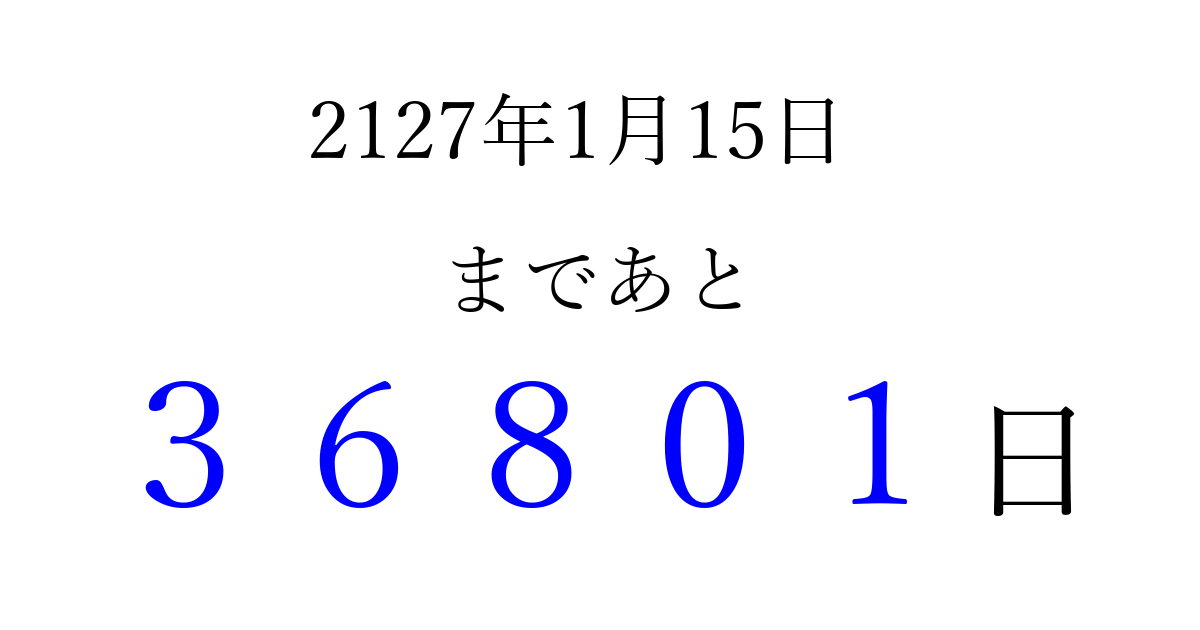2127年1月15日(水)まで あと 99999 日です 追加すると、トップページからすぐ選べるようになります ※2026/04/13現在の結果です。 最新の状態に更新する ↓シェアして、タイムライン上にカウントダウンを表示しよう!↓ 📤 この結果を共有する Tweet シェア Threads Bluesky 別の日付でカウントダウン 2127年1月のカレンダー このページをブックマークに追加すると、いつでもカウントダウンを確認できます。 (PC: Ctrl+D / Mac: ⌘+D) hitome-notes.comでは以下のページも運営しています。 指定日と期間から日付を計算 | ガチャ確率計算・シミュレーション | プライバシー・ポリシー 運営者:Avocado