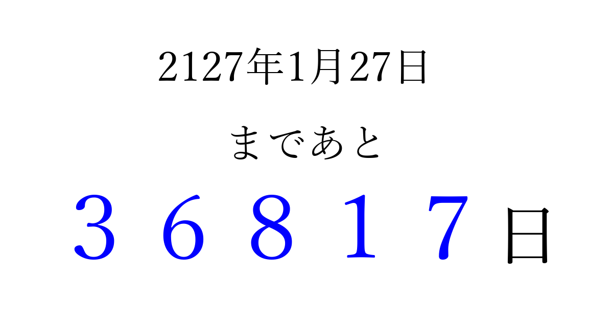 2127年1月27日(月)まで あと 99999 日です 追加すると、トップページからすぐ選べるようになります ※2026/04/09現在の結果です。 最新の状態に更新する ↓シェアして、タイムライン上にカウントダウンを表示しよう!↓ 📤 この結果を共有する Tweet シェア Threads Bluesky 別の日付でカウントダウン 2127年1月のカレンダー このページをブックマークに追加すると、いつでもカウントダウンを確認できます。 (PC: Ctrl+D / Mac: ⌘+D) hitome-notes.comでは以下のページも運営しています。 指定日と期間から日付を計算 | ガチャ確率計算・シミュレーション | プライバシー・ポリシー 運営者:Avocado