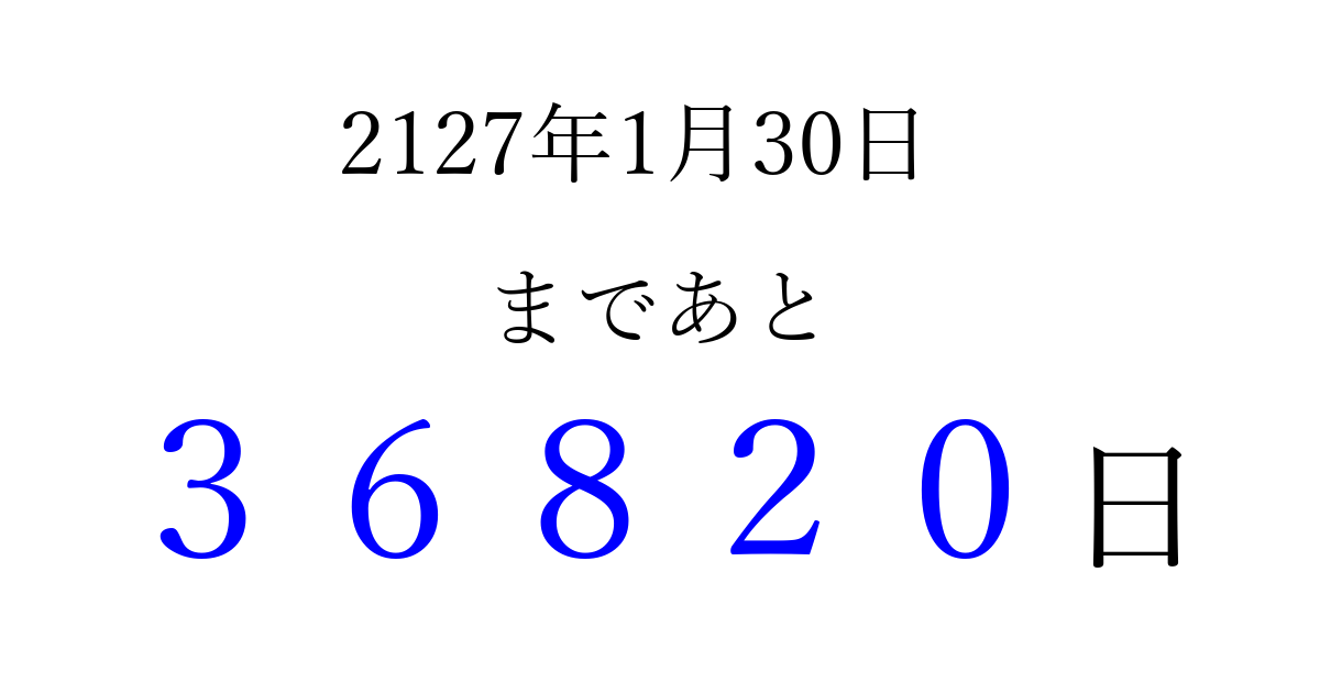 2127年1月30日(木)まで あと 99999 日です 追加すると、トップページからすぐ選べるようになります ※2026/04/09現在の結果です。 最新の状態に更新する ↓シェアして、タイムライン上にカウントダウンを表示しよう!↓ 📤 この結果を共有する Tweet シェア Threads Bluesky 別の日付でカウントダウン 2127年1月のカレンダー このページをブックマークに追加すると、いつでもカウントダウンを確認できます。 (PC: Ctrl+D / Mac: ⌘+D) hitome-notes.comでは以下のページも運営しています。 指定日と期間から日付を計算 | ガチャ確率計算・シミュレーション | プライバシー・ポリシー 運営者:Avocado