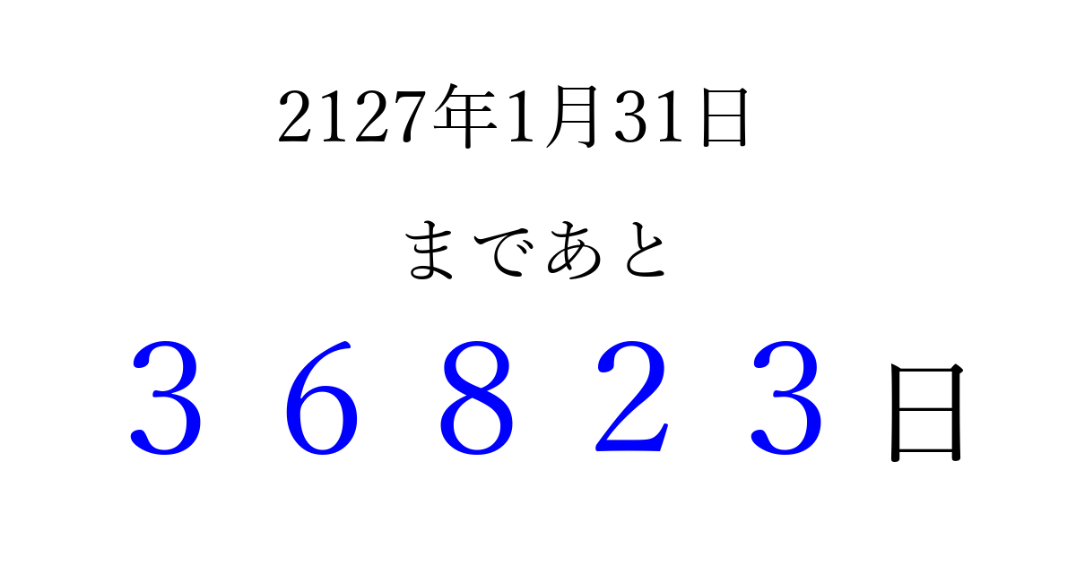 2127年1月31日(金)まで あと 99999 日です 追加すると、トップページからすぐ選べるようになります ※2026/04/07現在の結果です。 最新の状態に更新する ↓シェアして、タイムライン上にカウントダウンを表示しよう!↓ 📤 この結果を共有する Tweet シェア Threads Bluesky 別の日付でカウントダウン 2127年1月のカレンダー このページをブックマークに追加すると、いつでもカウントダウンを確認できます。 (PC: Ctrl+D / Mac: ⌘+D) hitome-notes.comでは以下のページも運営しています。 指定日と期間から日付を計算 | ガチャ確率計算・シミュレーション | プライバシー・ポリシー 運営者:Avocado