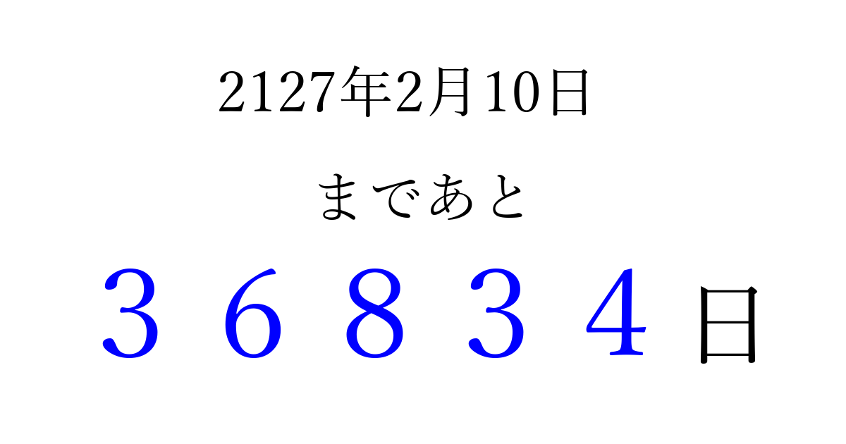 2127年2月10日(月)まで あと 99999 日です 追加すると、トップページからすぐ選べるようになります ※2026/04/06現在の結果です。 最新の状態に更新する ↓シェアして、タイムライン上にカウントダウンを表示しよう!↓ 📤 この結果を共有する Tweet シェア Threads Bluesky 別の日付でカウントダウン 2127年2月のカレンダー このページをブックマークに追加すると、いつでもカウントダウンを確認できます。 (PC: Ctrl+D / Mac: ⌘+D) hitome-notes.comでは以下のページも運営しています。 指定日と期間から日付を計算 | ガチャ確率計算・シミュレーション | プライバシー・ポリシー 運営者:Avocado