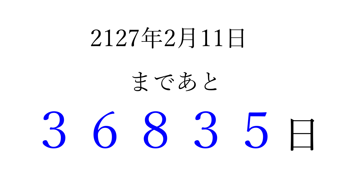 2127年2月11日(火)まで あと 99999 日です 追加すると、トップページからすぐ選べるようになります ※2026/04/06現在の結果です。 最新の状態に更新する ↓シェアして、タイムライン上にカウントダウンを表示しよう!↓ 📤 この結果を共有する Tweet シェア Threads Bluesky 別の日付でカウントダウン 2127年2月のカレンダー このページをブックマークに追加すると、いつでもカウントダウンを確認できます。 (PC: Ctrl+D / Mac: ⌘+D) hitome-notes.comでは以下のページも運営しています。 指定日と期間から日付を計算 | ガチャ確率計算・シミュレーション | プライバシー・ポリシー 運営者:Avocado
