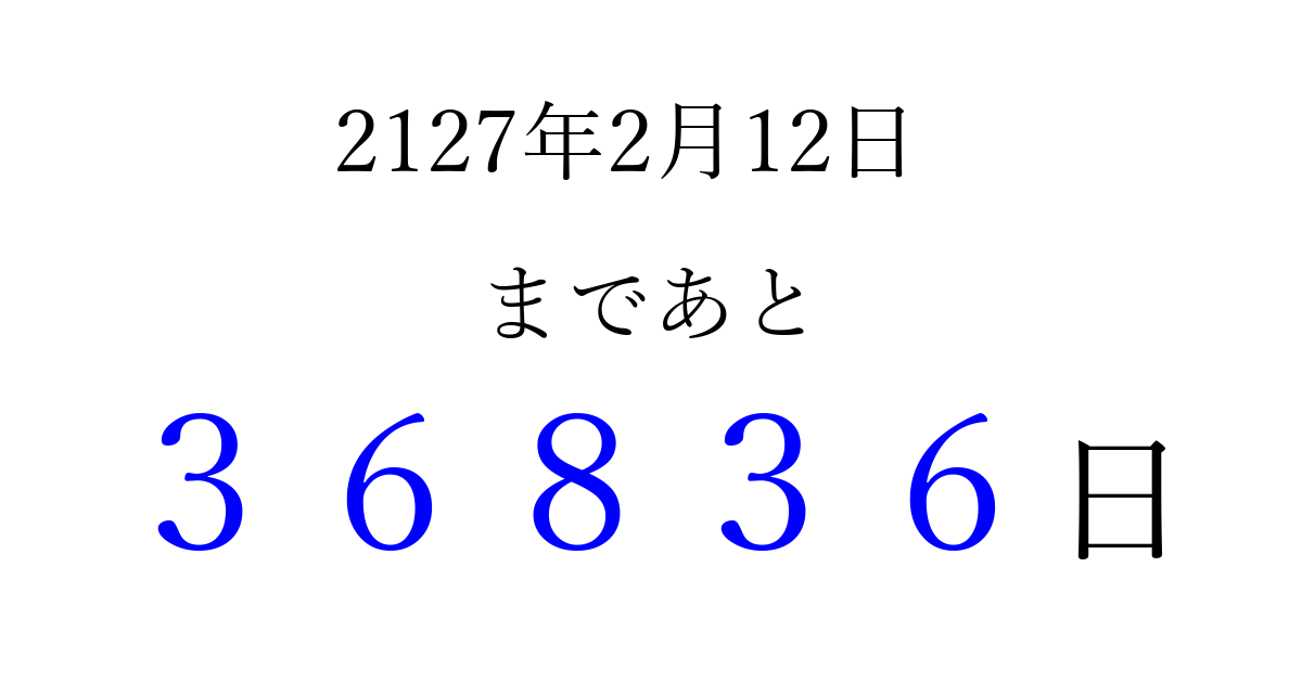 2127年2月12日(水)まで あと 99999 日です 追加すると、トップページからすぐ選べるようになります ※2026/04/06現在の結果です。 最新の状態に更新する ↓シェアして、タイムライン上にカウントダウンを表示しよう!↓ 📤 この結果を共有する Tweet シェア Threads Bluesky 別の日付でカウントダウン 2127年2月のカレンダー このページをブックマークに追加すると、いつでもカウントダウンを確認できます。 (PC: Ctrl+D / Mac: ⌘+D) hitome-notes.comでは以下のページも運営しています。 指定日と期間から日付を計算 | ガチャ確率計算・シミュレーション | プライバシー・ポリシー 運営者:Avocado