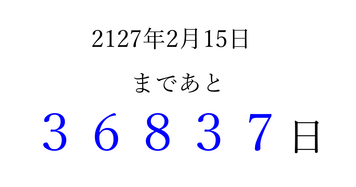 2127年2月15日(土)まで あと 99999 日です 追加すると、トップページからすぐ選べるようになります ※2026/04/08現在の結果です。 最新の状態に更新する ↓シェアして、タイムライン上にカウントダウンを表示しよう!↓ 📤 この結果を共有する Tweet シェア Threads Bluesky 別の日付でカウントダウン 2127年2月のカレンダー このページをブックマークに追加すると、いつでもカウントダウンを確認できます。 (PC: Ctrl+D / Mac: ⌘+D) hitome-notes.comでは以下のページも運営しています。 指定日と期間から日付を計算 | ガチャ確率計算・シミュレーション | プライバシー・ポリシー 運営者:Avocado
