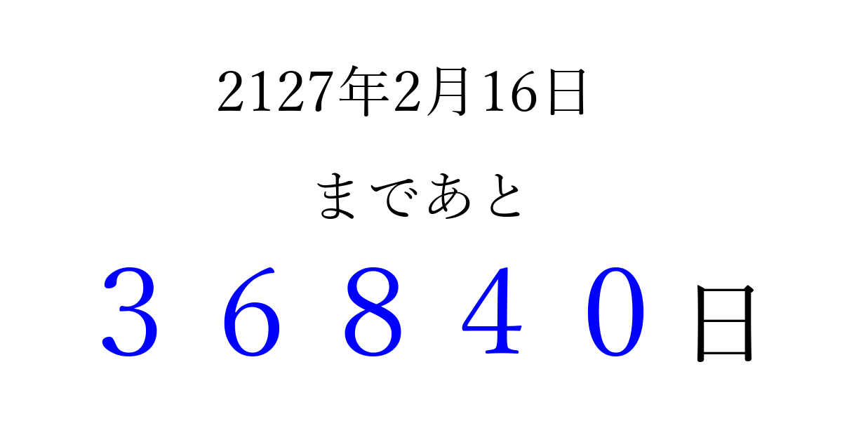 2127年2月16日(日)まで あと 99999 日です 追加すると、トップページからすぐ選べるようになります ※2026/04/06現在の結果です。 最新の状態に更新する ↓シェアして、タイムライン上にカウントダウンを表示しよう!↓ 📤 この結果を共有する Tweet シェア Threads Bluesky 別の日付でカウントダウン 2127年2月のカレンダー このページをブックマークに追加すると、いつでもカウントダウンを確認できます。 (PC: Ctrl+D / Mac: ⌘+D) hitome-notes.comでは以下のページも運営しています。 指定日と期間から日付を計算 | ガチャ確率計算・シミュレーション | プライバシー・ポリシー 運営者:Avocado