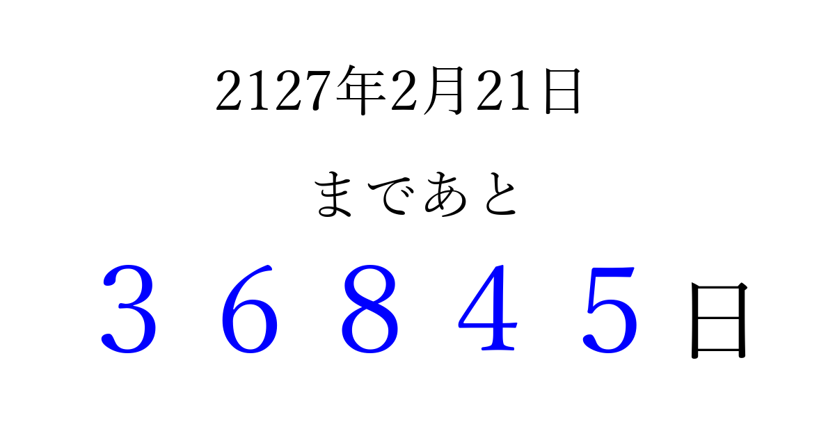 2127年2月21日(金)まで あと 99999 日です 追加すると、トップページからすぐ選べるようになります ※2026/04/06現在の結果です。 最新の状態に更新する ↓シェアして、タイムライン上にカウントダウンを表示しよう!↓ 📤 この結果を共有する Tweet シェア Threads Bluesky 別の日付でカウントダウン 2127年2月のカレンダー このページをブックマークに追加すると、いつでもカウントダウンを確認できます。 (PC: Ctrl+D / Mac: ⌘+D) hitome-notes.comでは以下のページも運営しています。 指定日と期間から日付を計算 | ガチャ確率計算・シミュレーション | プライバシー・ポリシー 運営者:Avocado