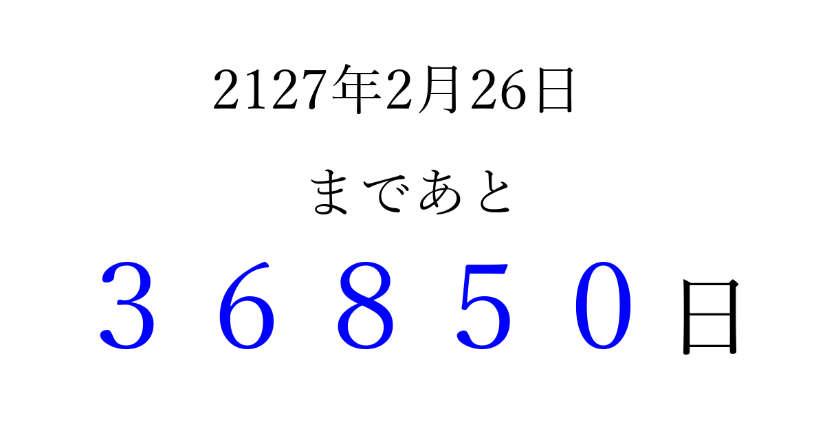 2127年2月26日(水)まで あと 99999 日です 追加すると、トップページからすぐ選べるようになります ※2026/04/06現在の結果です。 最新の状態に更新する ↓シェアして、タイムライン上にカウントダウンを表示しよう!↓ 📤 この結果を共有する Tweet シェア Threads Bluesky 別の日付でカウントダウン 2127年2月のカレンダー このページをブックマークに追加すると、いつでもカウントダウンを確認できます。 (PC: Ctrl+D / Mac: ⌘+D) hitome-notes.comでは以下のページも運営しています。 指定日と期間から日付を計算 | ガチャ確率計算・シミュレーション | プライバシー・ポリシー 運営者:Avocado