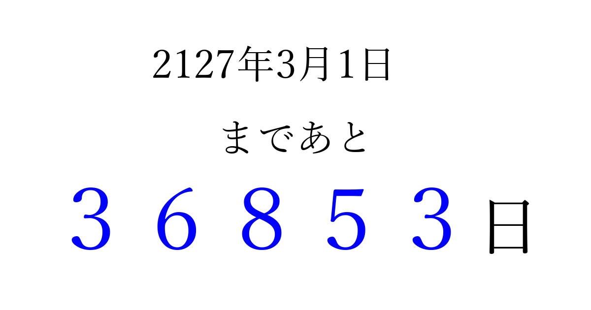 2127年3月1日(土)まで あと 99999 日です 追加すると、トップページからすぐ選べるようになります ※2026/04/06現在の結果です。 最新の状態に更新する ↓シェアして、タイムライン上にカウントダウンを表示しよう!↓ 📤 この結果を共有する Tweet シェア Threads Bluesky 別の日付でカウントダウン 2127年3月のカレンダー このページをブックマークに追加すると、いつでもカウントダウンを確認できます。 (PC: Ctrl+D / Mac: ⌘+D) hitome-notes.comでは以下のページも運営しています。 指定日と期間から日付を計算 | ガチャ確率計算・シミュレーション | プライバシー・ポリシー 運営者:Avocado