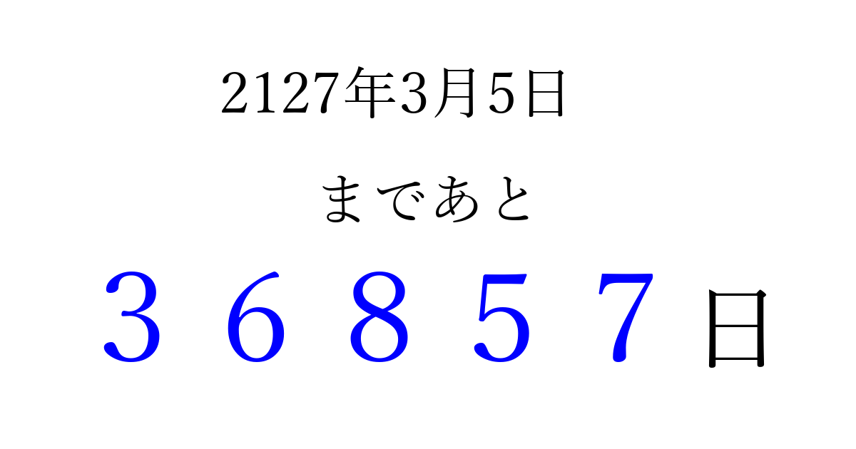 2127年3月5日(水)まで あと 99999 日です 追加すると、トップページからすぐ選べるようになります ※2026/04/06現在の結果です。 最新の状態に更新する ↓シェアして、タイムライン上にカウントダウンを表示しよう!↓ 📤 この結果を共有する Tweet シェア Threads Bluesky 別の日付でカウントダウン 2127年3月のカレンダー このページをブックマークに追加すると、いつでもカウントダウンを確認できます。 (PC: Ctrl+D / Mac: ⌘+D) hitome-notes.comでは以下のページも運営しています。 指定日と期間から日付を計算 | ガチャ確率計算・シミュレーション | プライバシー・ポリシー 運営者:Avocado