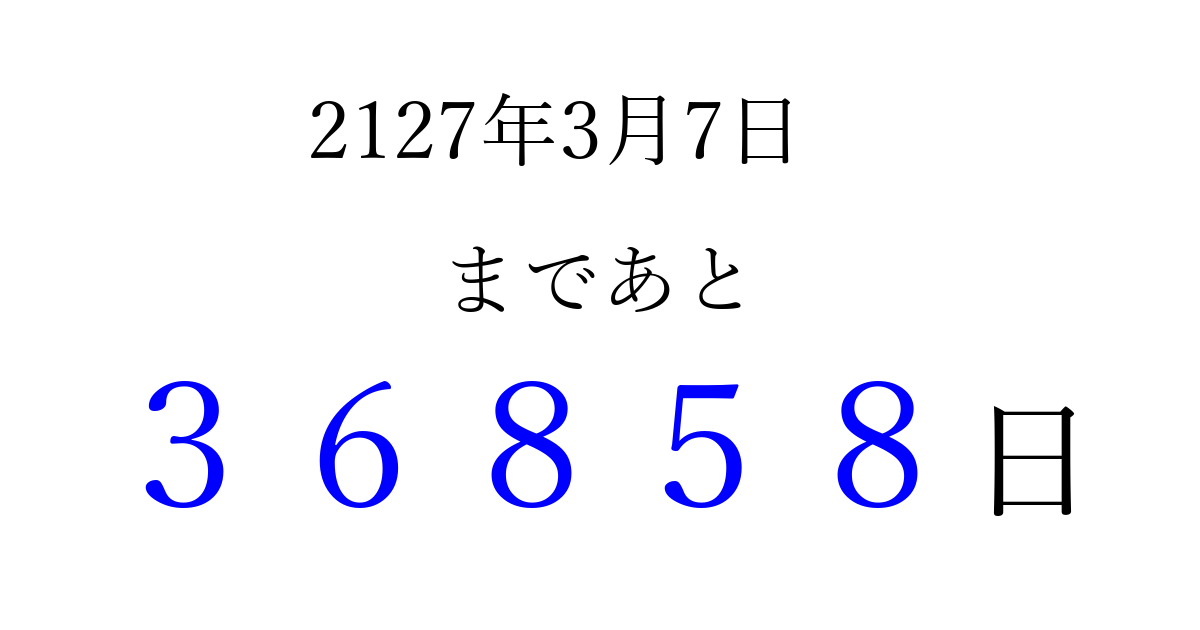 2127年3月7日(金)まで あと 99999 日です 追加すると、トップページからすぐ選べるようになります ※2026/04/07現在の結果です。 最新の状態に更新する ↓シェアして、タイムライン上にカウントダウンを表示しよう!↓ 📤 この結果を共有する Tweet シェア Threads Bluesky 別の日付でカウントダウン 2127年3月のカレンダー このページをブックマークに追加すると、いつでもカウントダウンを確認できます。 (PC: Ctrl+D / Mac: ⌘+D) hitome-notes.comでは以下のページも運営しています。 指定日と期間から日付を計算 | ガチャ確率計算・シミュレーション | プライバシー・ポリシー 運営者:Avocado