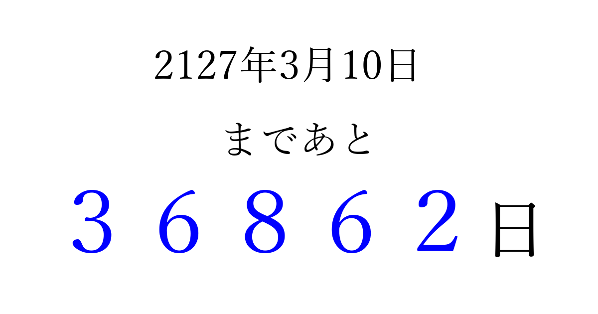 2127年3月10日(月)まで あと 99999 日です 追加すると、トップページからすぐ選べるようになります ※2026/04/06現在の結果です。 最新の状態に更新する ↓シェアして、タイムライン上にカウントダウンを表示しよう!↓ 📤 この結果を共有する Tweet シェア Threads Bluesky 別の日付でカウントダウン 2127年3月のカレンダー このページをブックマークに追加すると、いつでもカウントダウンを確認できます。 (PC: Ctrl+D / Mac: ⌘+D) hitome-notes.comでは以下のページも運営しています。 指定日と期間から日付を計算 | ガチャ確率計算・シミュレーション | プライバシー・ポリシー 運営者:Avocado