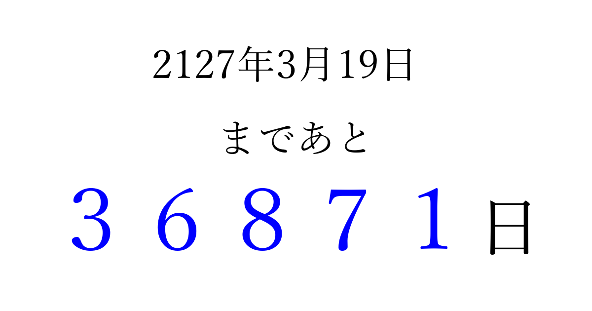 2127年3月19日(水)まで あと 99999 日です 追加すると、トップページからすぐ選べるようになります ※2026/04/06現在の結果です。 最新の状態に更新する ↓シェアして、タイムライン上にカウントダウンを表示しよう!↓ 📤 この結果を共有する Tweet シェア Threads Bluesky 別の日付でカウントダウン 2127年3月のカレンダー このページをブックマークに追加すると、いつでもカウントダウンを確認できます。 (PC: Ctrl+D / Mac: ⌘+D) hitome-notes.comでは以下のページも運営しています。 指定日と期間から日付を計算 | ガチャ確率計算・シミュレーション | プライバシー・ポリシー 運営者:Avocado