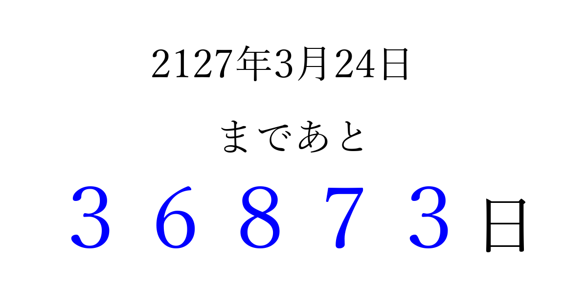 2127年3月24日(月)まで あと 99999 日です 追加すると、トップページからすぐ選べるようになります ※2026/04/09現在の結果です。 最新の状態に更新する ↓シェアして、タイムライン上にカウントダウンを表示しよう!↓ 📤 この結果を共有する Tweet シェア Threads Bluesky 別の日付でカウントダウン 2127年3月のカレンダー このページをブックマークに追加すると、いつでもカウントダウンを確認できます。 (PC: Ctrl+D / Mac: ⌘+D) hitome-notes.comでは以下のページも運営しています。 指定日と期間から日付を計算 | ガチャ確率計算・シミュレーション | プライバシー・ポリシー 運営者:Avocado