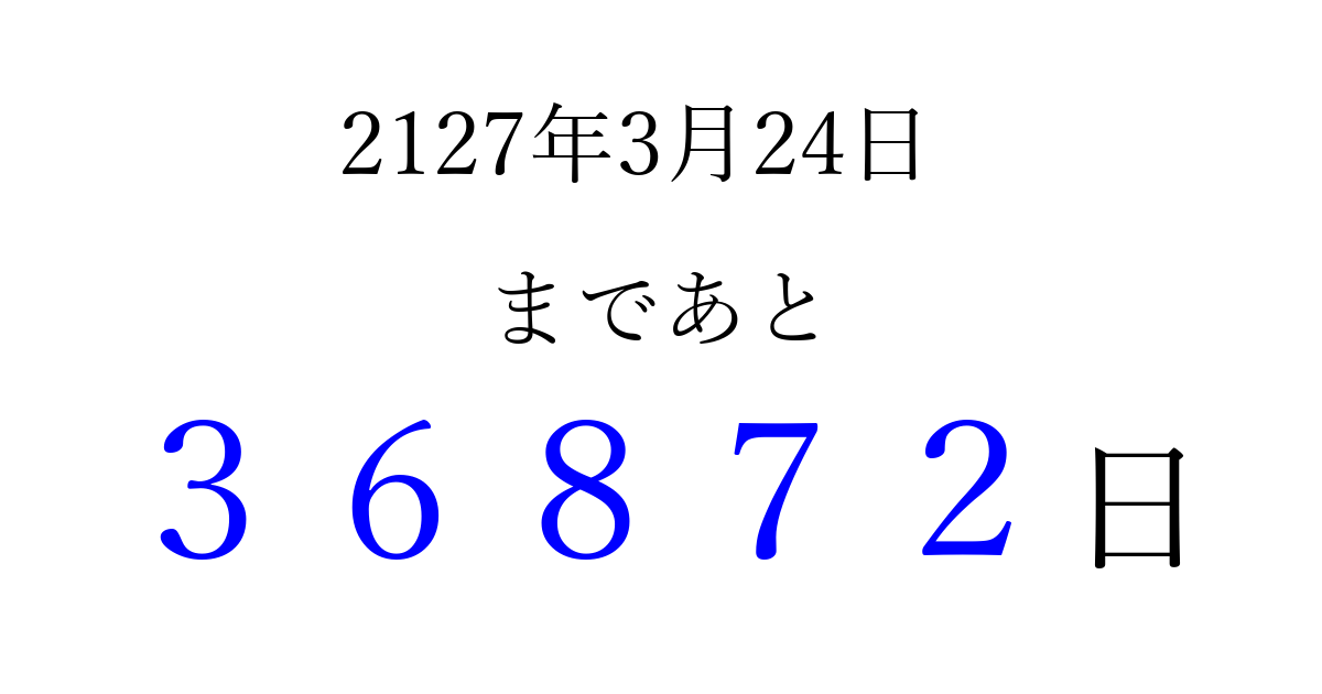 2127年3月24日(月)まで あと 99999 日です 追加すると、トップページからすぐ選べるようになります ※2026/04/10現在の結果です。 最新の状態に更新する ↓シェアして、タイムライン上にカウントダウンを表示しよう!↓ 📤 この結果を共有する Tweet シェア Threads Bluesky 別の日付でカウントダウン 2127年3月のカレンダー このページをブックマークに追加すると、いつでもカウントダウンを確認できます。 (PC: Ctrl+D / Mac: ⌘+D) hitome-notes.comでは以下のページも運営しています。 指定日と期間から日付を計算 | ガチャ確率計算・シミュレーション | プライバシー・ポリシー 運営者:Avocado